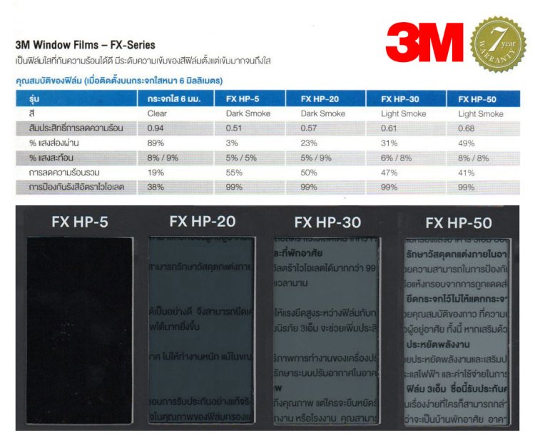 3เอ็ม ผู้นำนวัตกรรมฟิล์มกรองแสงรายแรกของโลก มีหลากหลายรุ่นในแบรนด์ และได้รับความเชื่อถือในคุณภาพผลิตภัณฑ์อย่างแพร่หลายและทั่วโลก เนื้อฟิล์มมีสารเคลือบป้องกันความร้อนและรังสี UV จึงช่วยปกป้องผู้ที่อยู่ในอาคารจากรังสีความร้อน